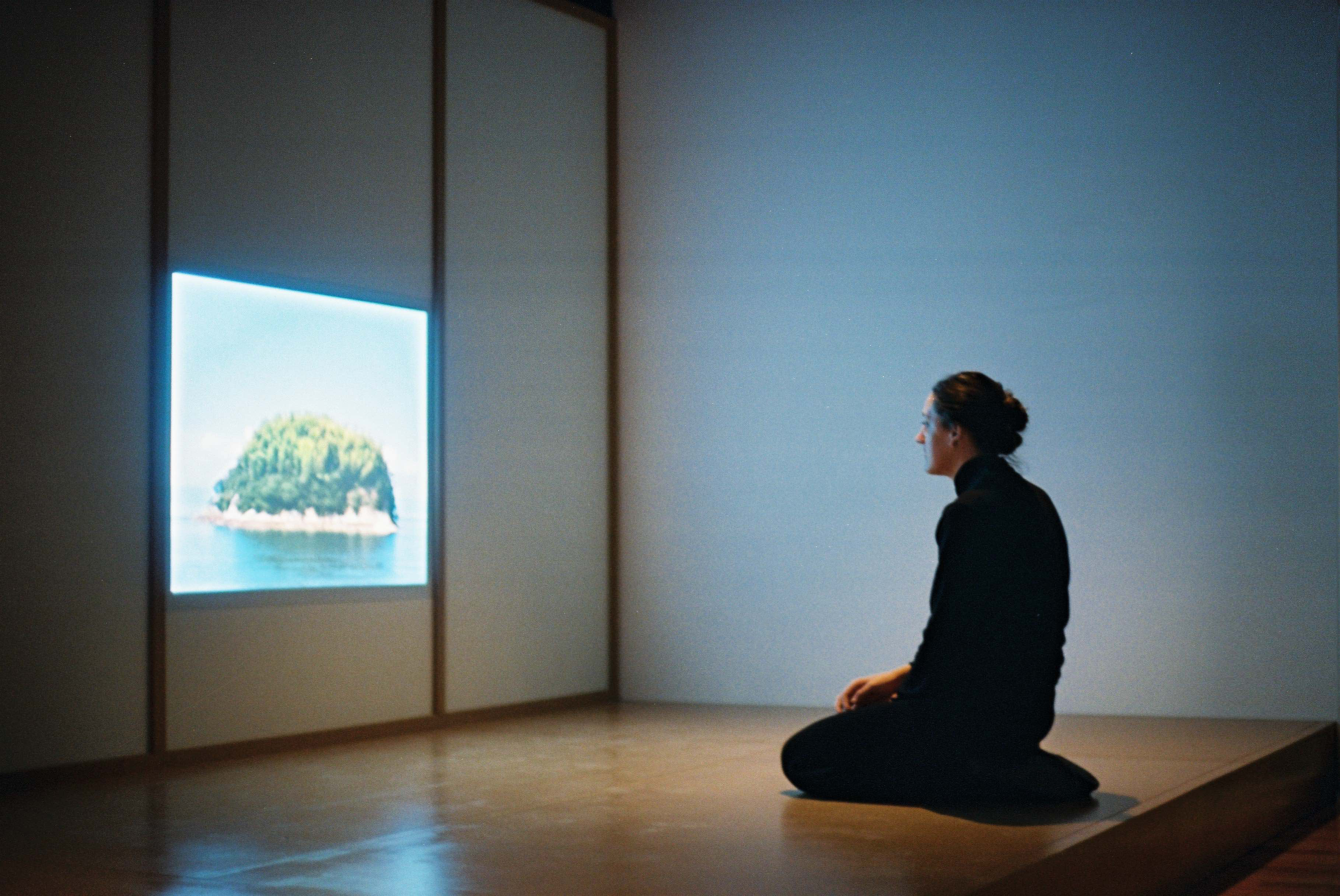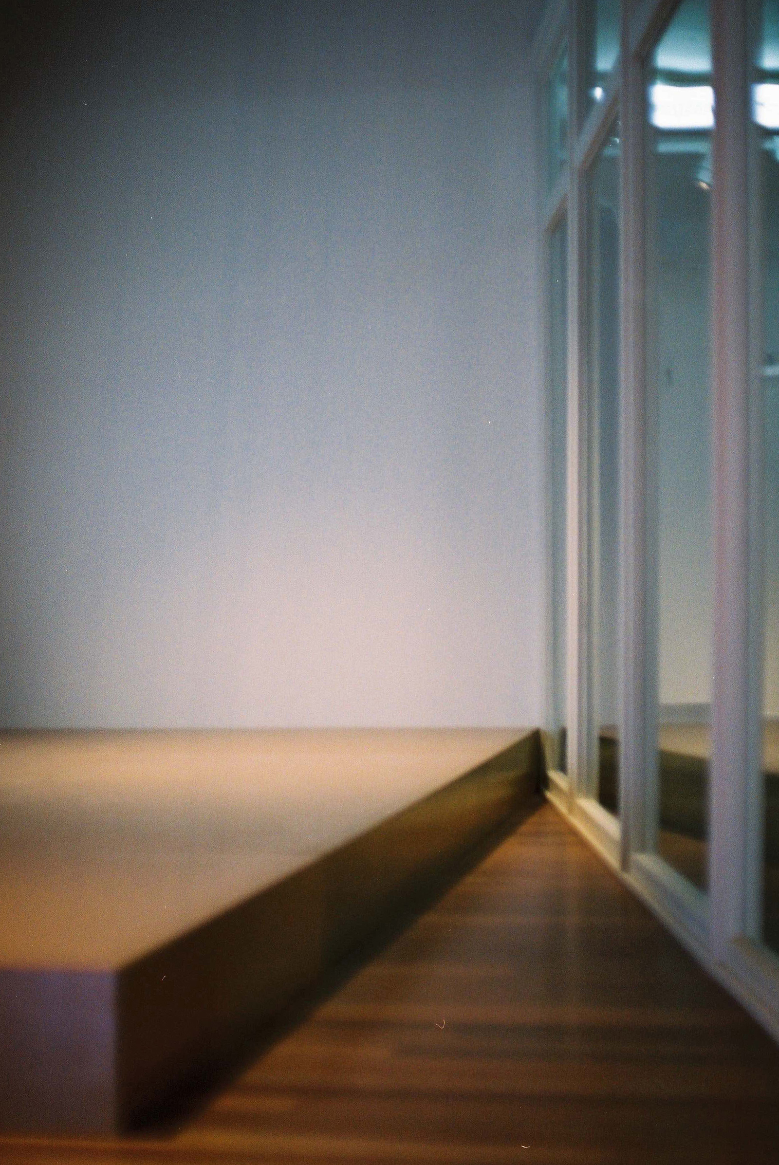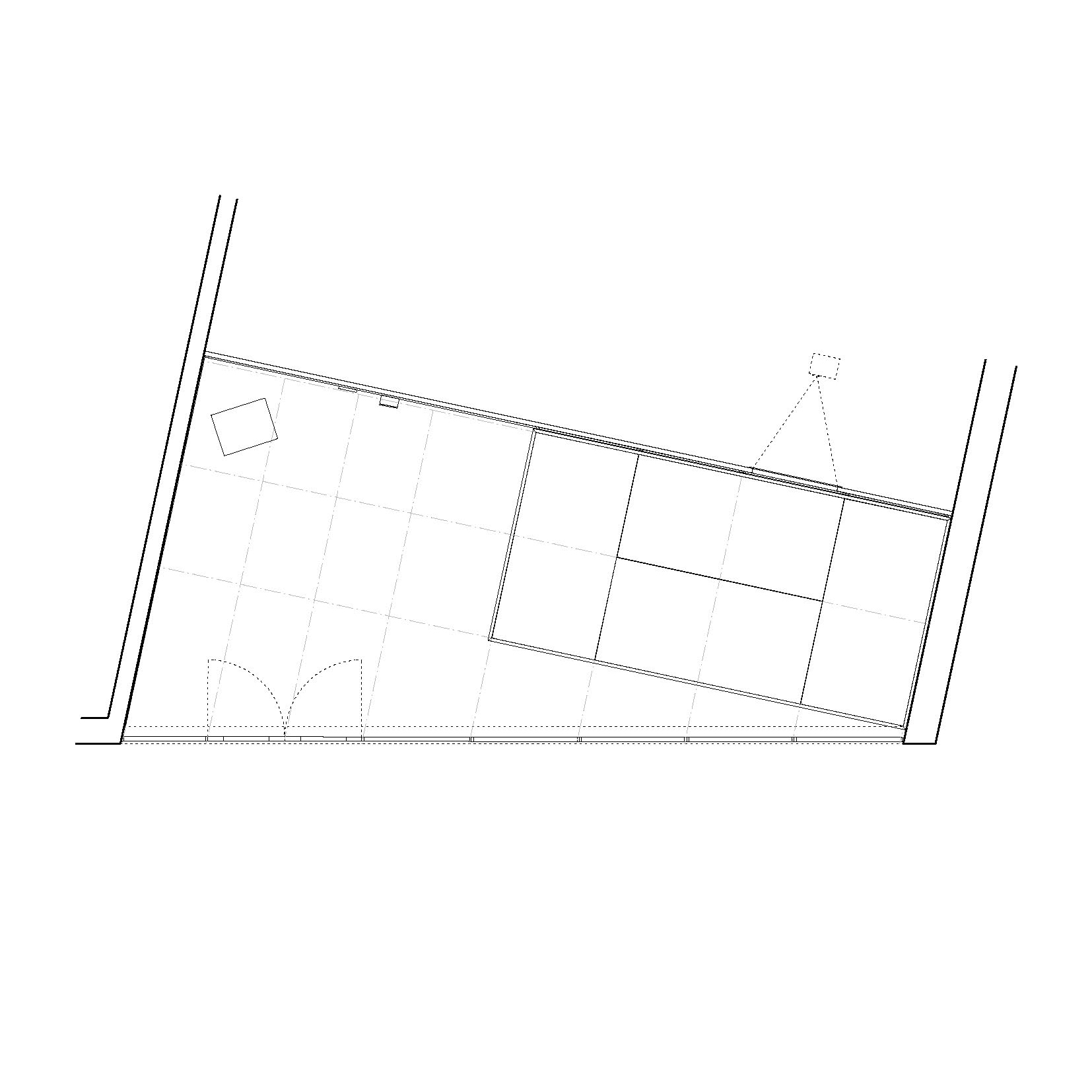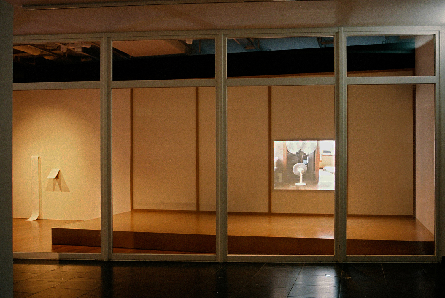 The installation takes hint from the repetitive rhythm of the existing windows towards the foyer. Echoing the exact width of the windows as a modular dimension, a rectangular platform is placed gently against the newly built stud wall, where the film is projected. While the triangular gap created by the oblique angle of the existing walls distinguish the platform from the room, the window rhythm repeated in the installation itself connect the two. The platform therefor plays an ambiguous role both as an isolated place dedicated to experiencing the work and as an integral part of the room itself, slowly transforming the window into a vitrine that further activates the dead-end foyer space in front.