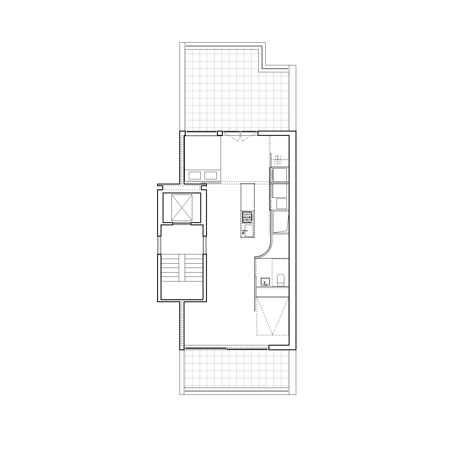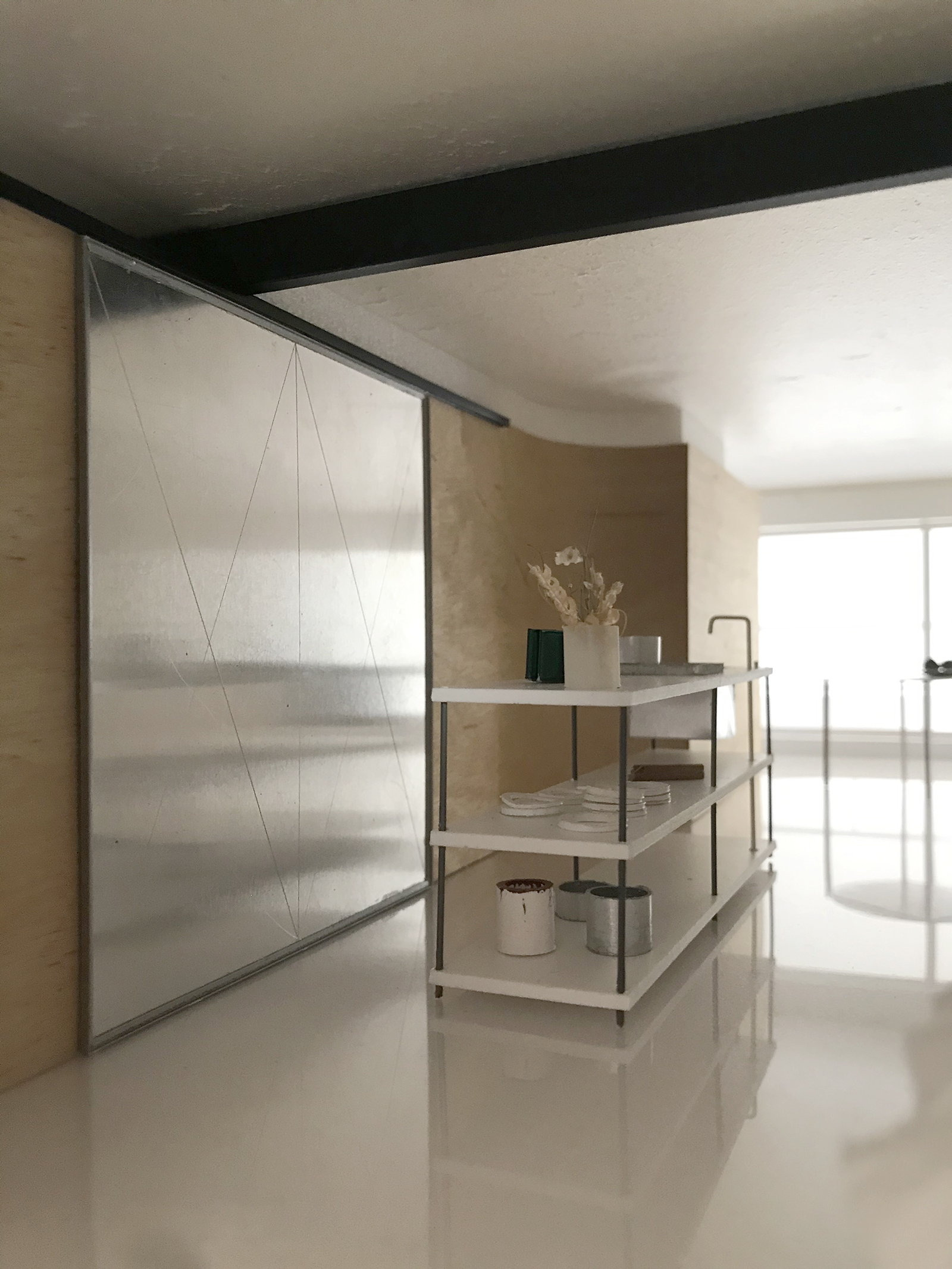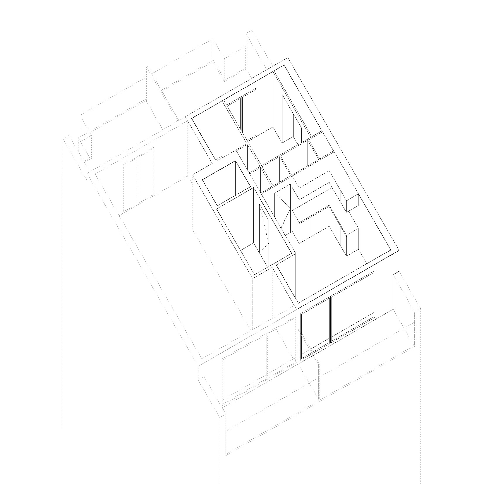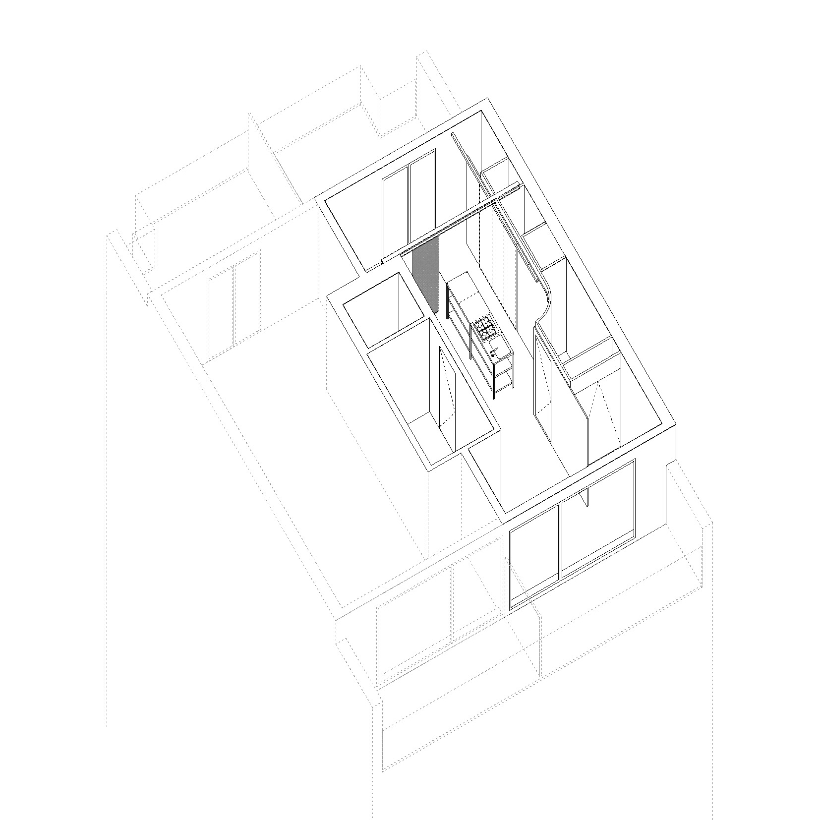 To transform the existing one bedroom 35m2 interior into a flexible living space with multiple sleeping quarters, an alternative take on a mode of living was asked for. Instead of placing partition walls parallel to the windows, a light furniture wall is placed along the depth of the apartment, creating two very deep and narrow zones. On one side, the spaces are subdivided into smaller utility rooms such as a bathroom, a storage, technical shafts, etc. On the other side, an open space with a floating kitchen table gives way to a transversal view. The lightly placed manner of this new wall creates niches on each corner of the apartment, providing enough privacy for 2 sleeping quarters. Finally, a beam lightly placed perpendicular to the furniture wall provides the possibility to close the apartment entirely into two when necessary.