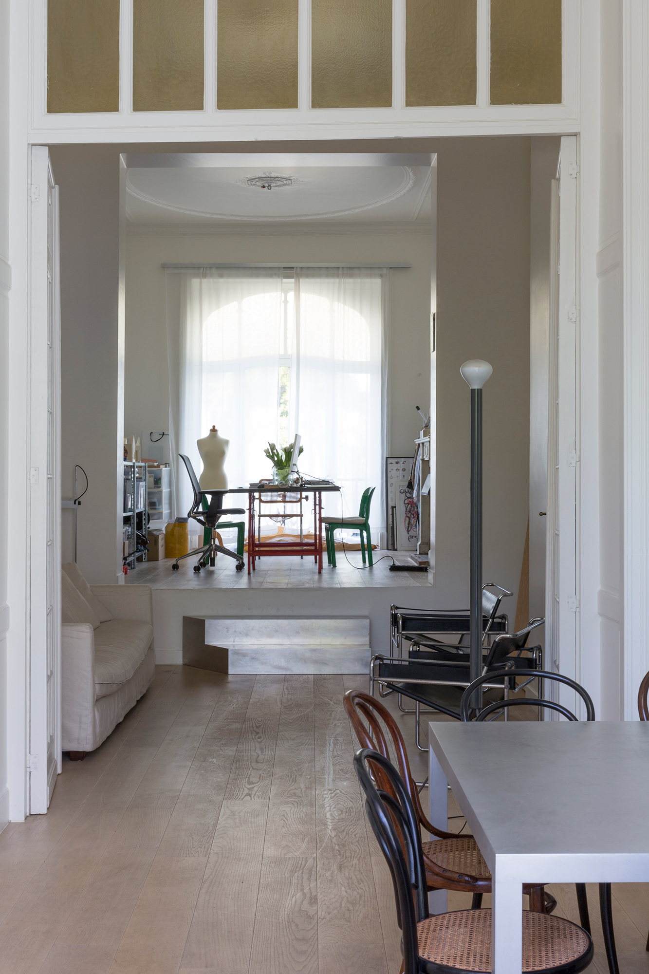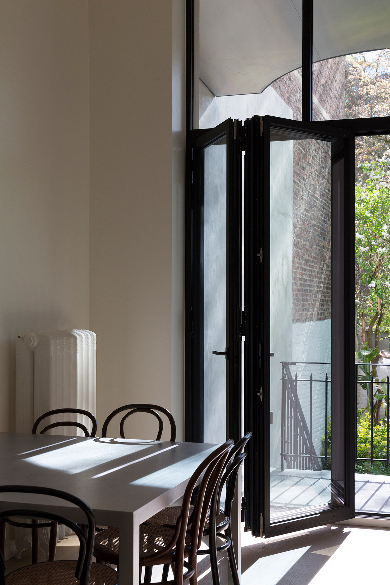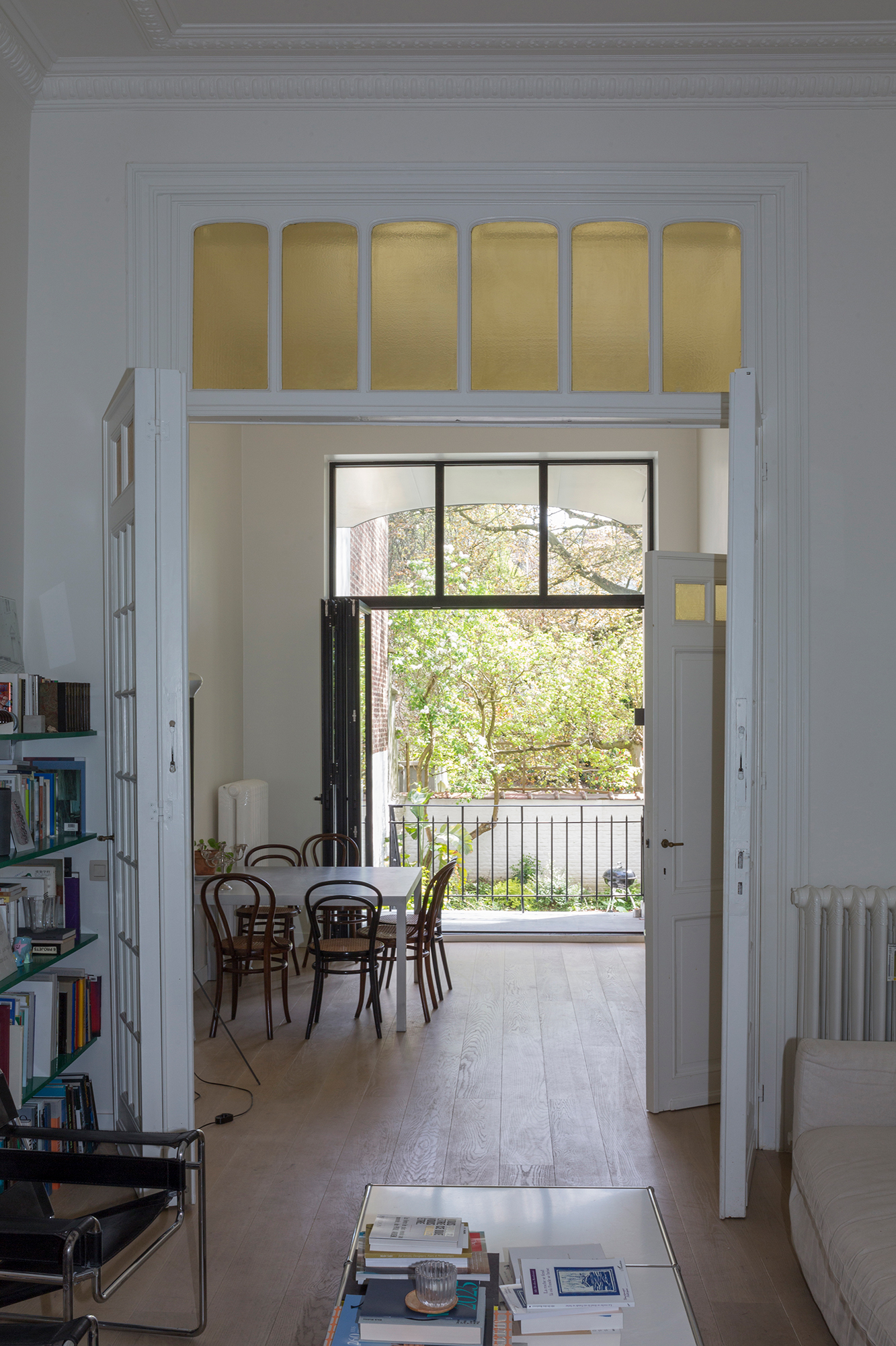 When asked for the renovation of the ground-floor duplex apartment, we took it as an opportunity to make site-specific interventions that aimed to correct such incoherences in the existing – a kitchen, a bedroom cupboard and a spacious bathroom that all respond to the specific conditions of the given context, a metallic staircase that reacts to the different axis of the existing openings in the living room enfilade, and last but not least a new contemporary roof in the garden facade, clearly marking the horizon of the belle-etage while providing an additional roofed area to the duplex apartment.