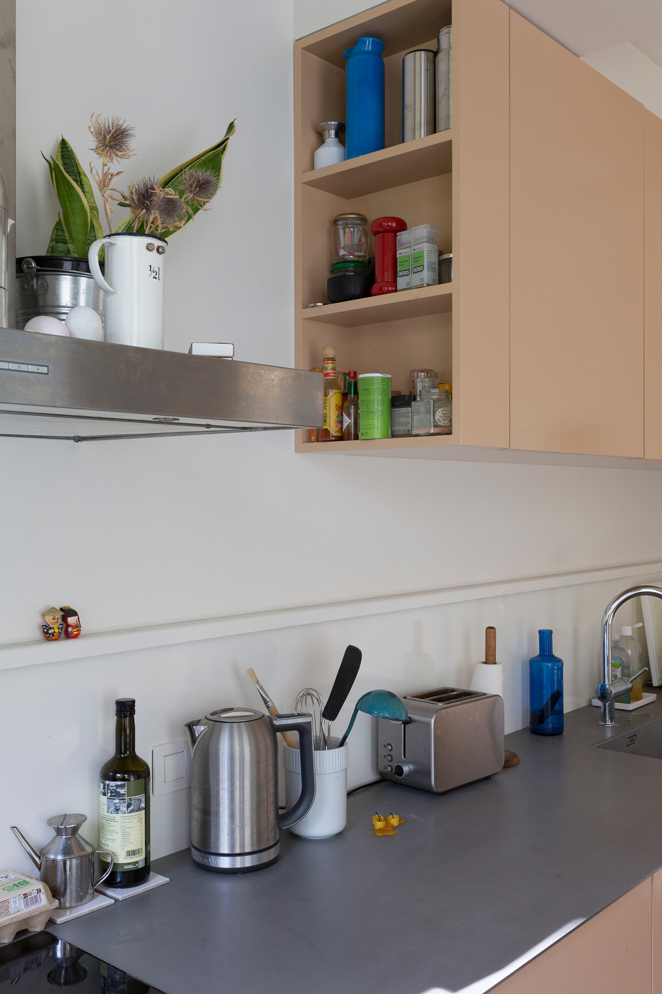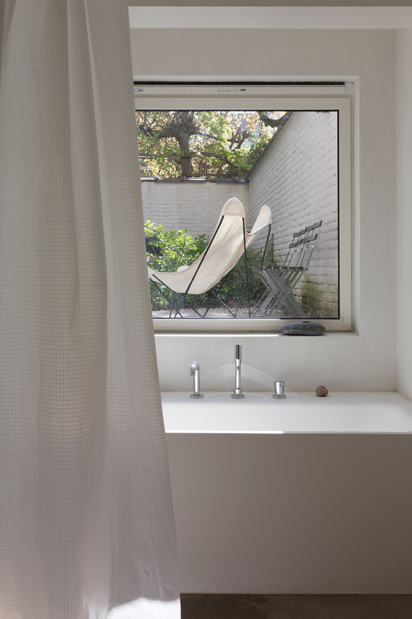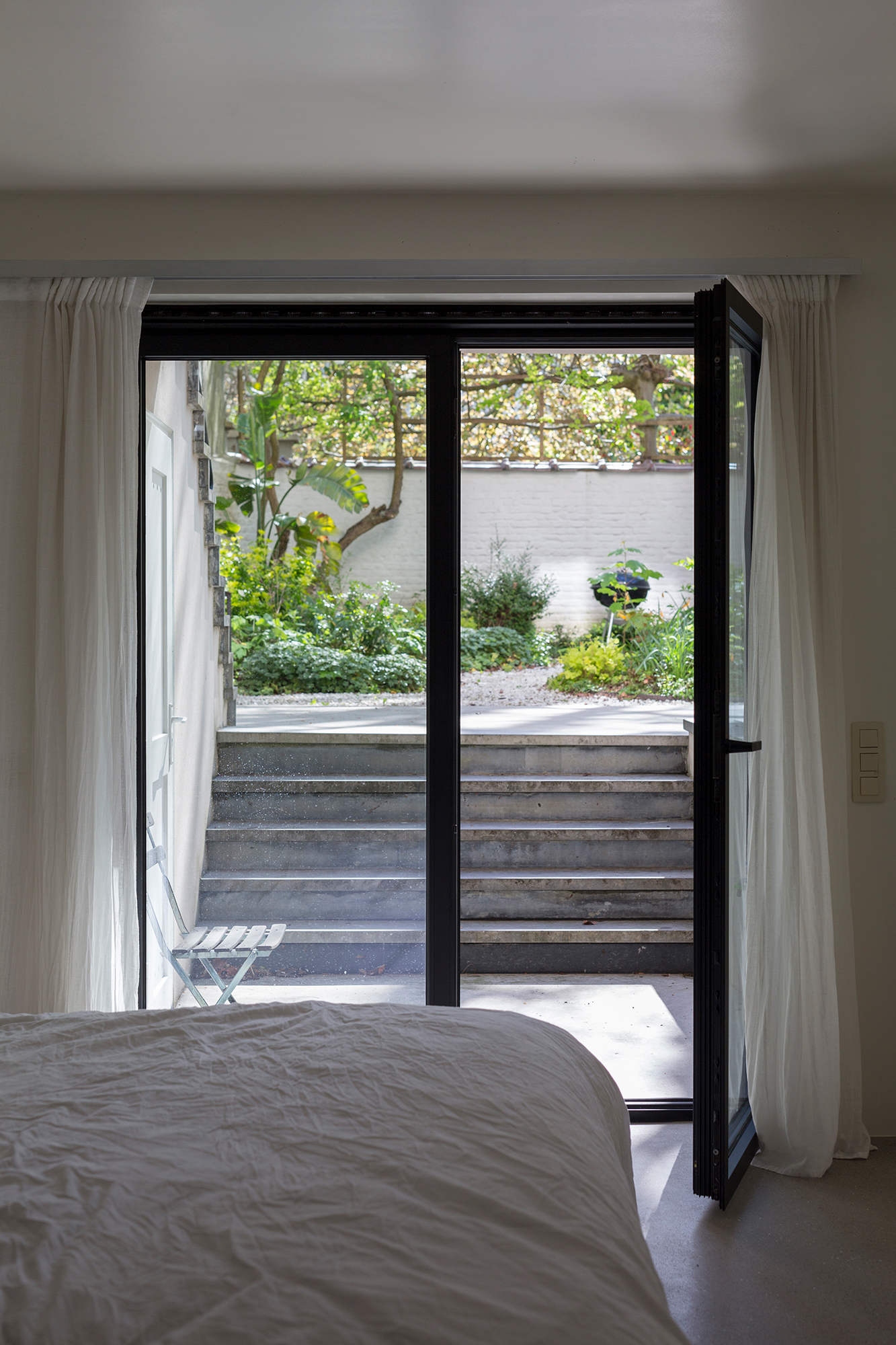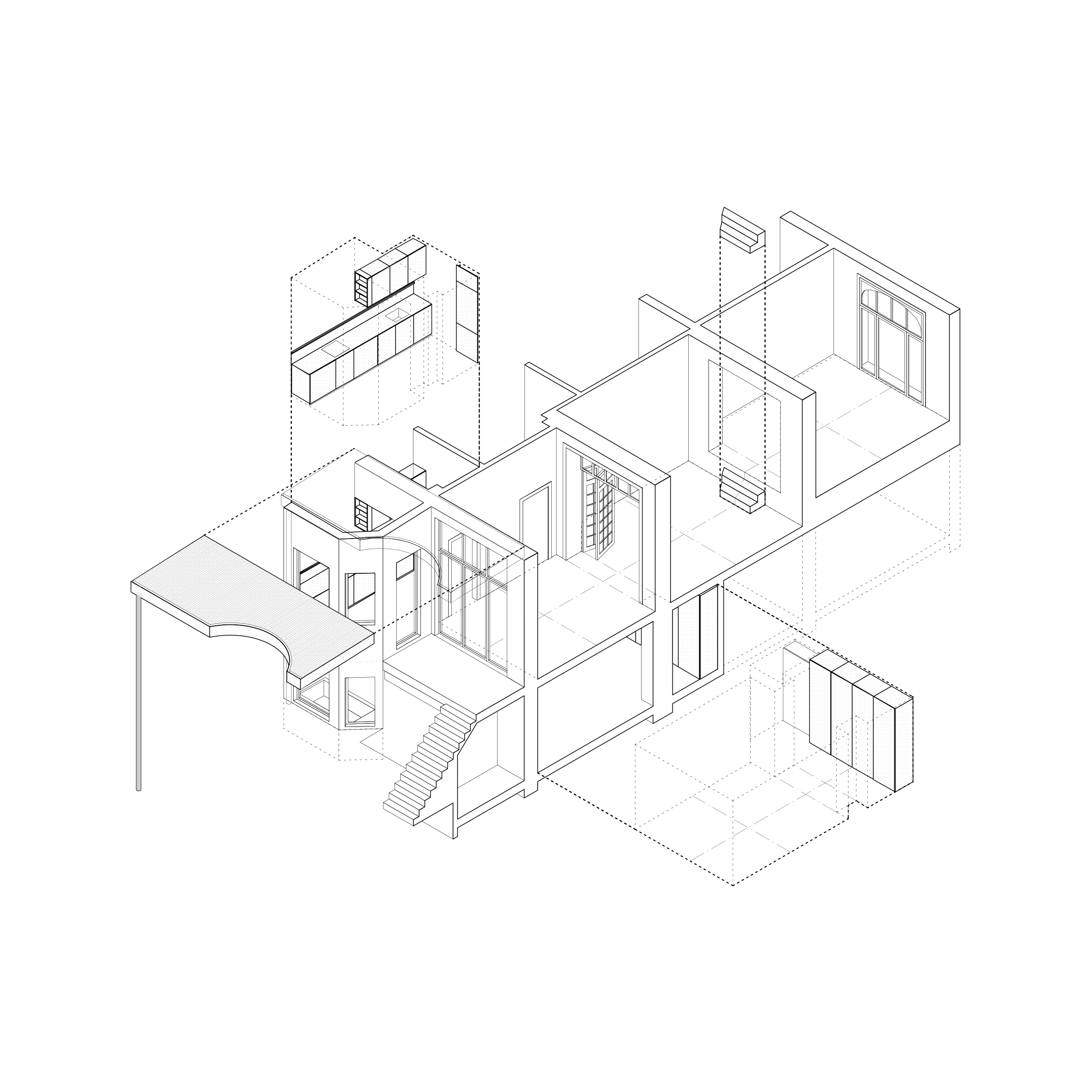 When asked for the renovation of the ground-floor duplex apartment, we took it as an opportunity to make site-specific interventions that aimed to correct such incoherences in the existing – a kitchen, a bedroom cupboard and a spacious bathroom that all respond to the specific conditions of the given context, a metallic staircase that reacts to the different axis of the existing openings in the living room enfilade, and last but not least a new contemporary roof in the garden facade, clearly marking the horizon of the belle-etage while providing an additional roofed area to the duplex apartment.