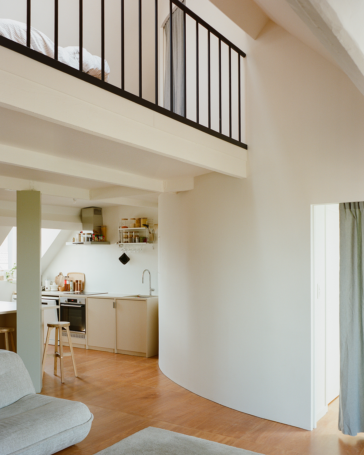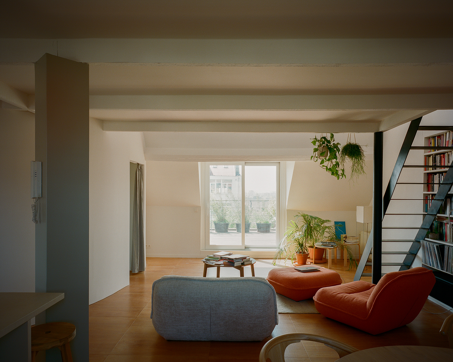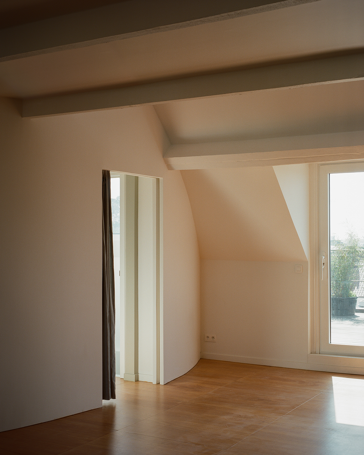 A single curved wall and a set of existing structural columns redefine the living space of a small penthouse apartment in Brussels.