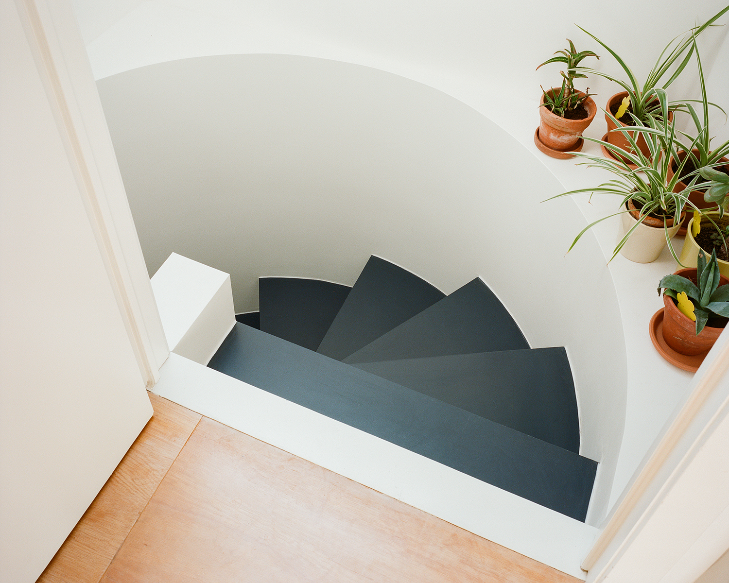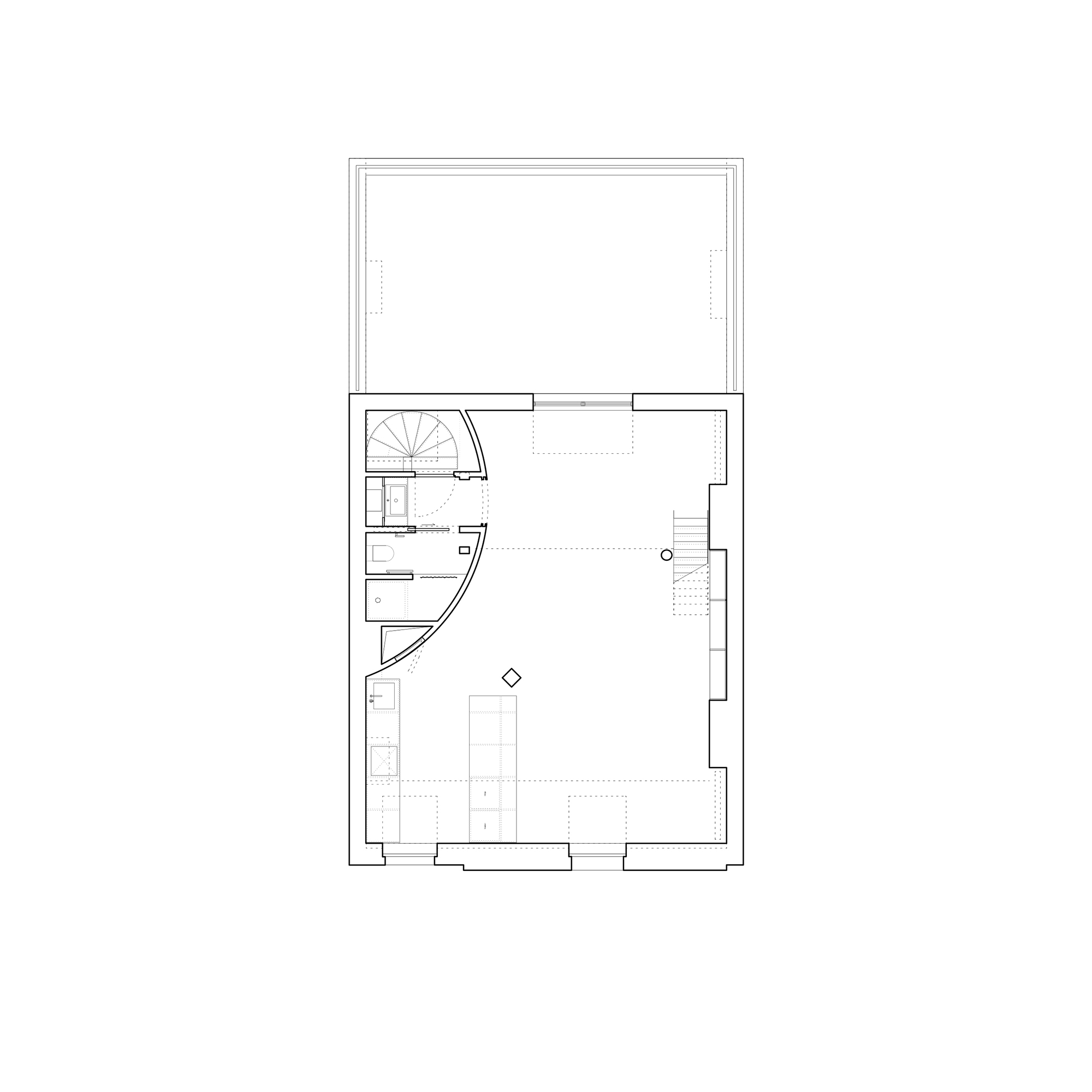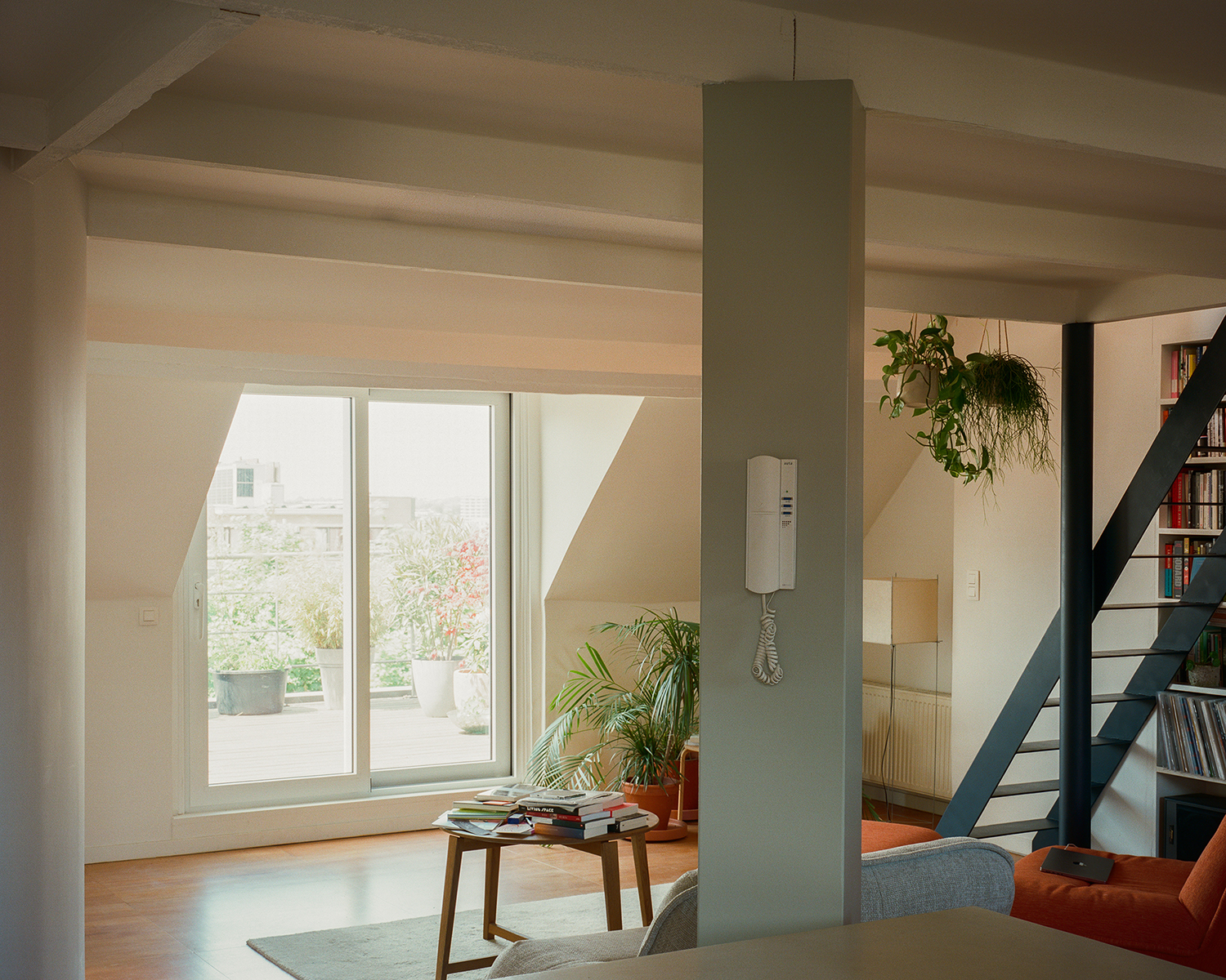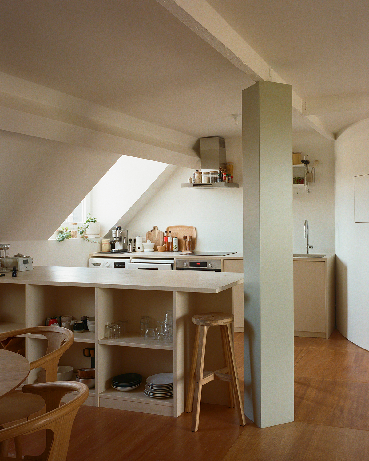 A single curved wall and a set of existing structural columns redefine the living space of a small penthouse apartment in Brussels.