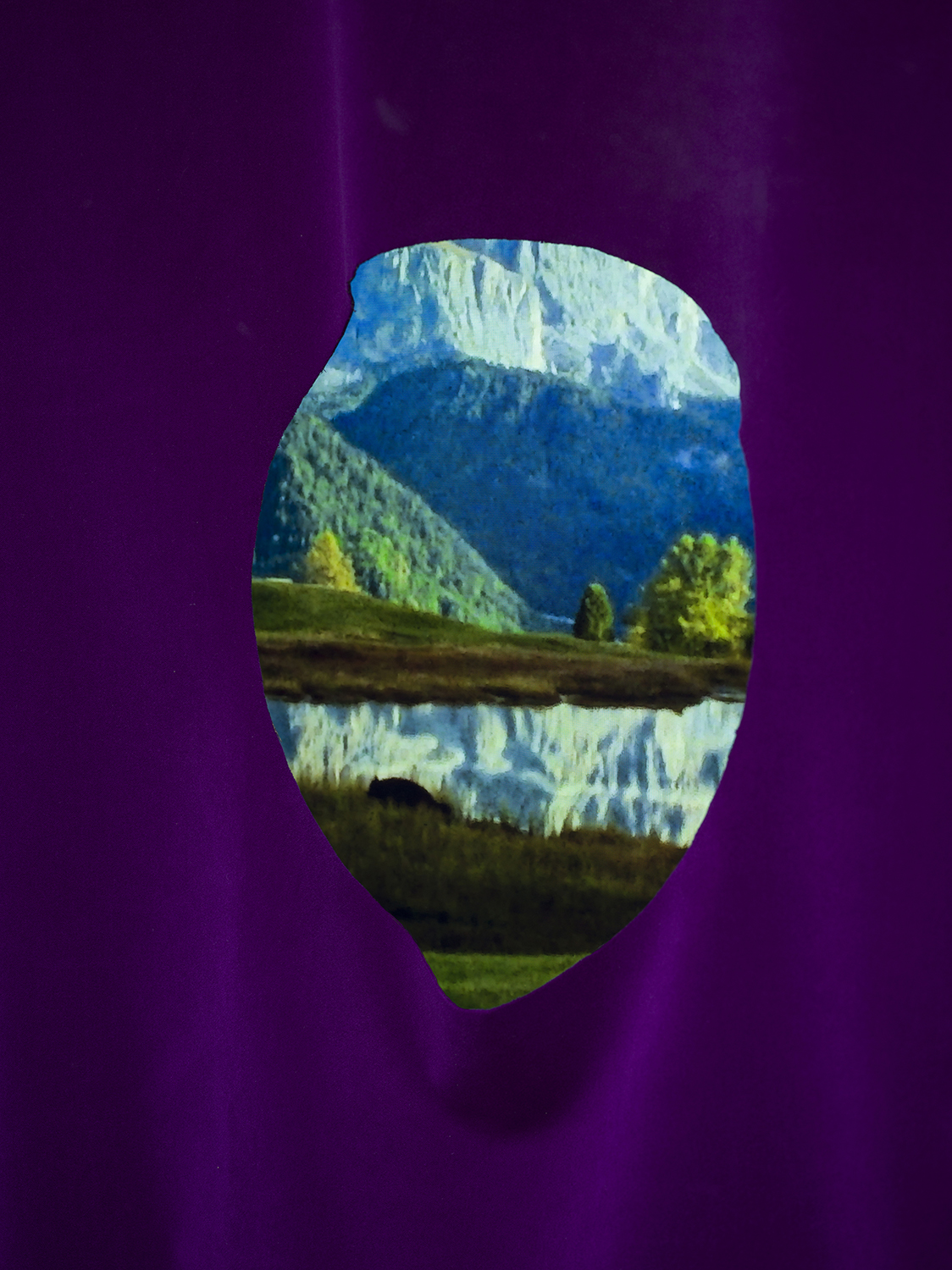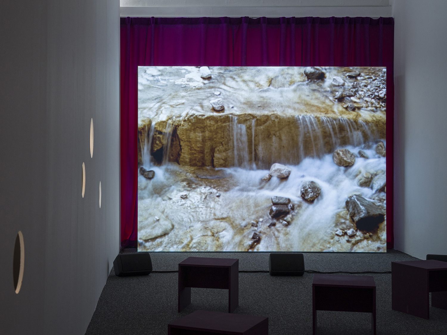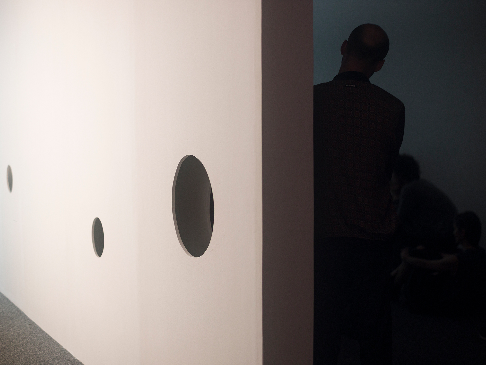The exhibition to be presented in the space was in many ways contradictory to the spatial qualities of the space. It consisted of a single art work that was shown on video projection. The deep interior was far too vast for a single work, and the vitrine became more as a burden as the projection required darkness. The scenography took these demands seriously and in turn used it to its advantage. The entire vitrine was closed off with a curtain. A long partition wall was placed in the interior, creating a long corridor to avoid light leak from the entrance. Yet with small circular holes placed throughout the installation, the scenography became a playful device both towards the street as inside the gallery, transforming the exhibition of the single art work into a multitude of experiences.