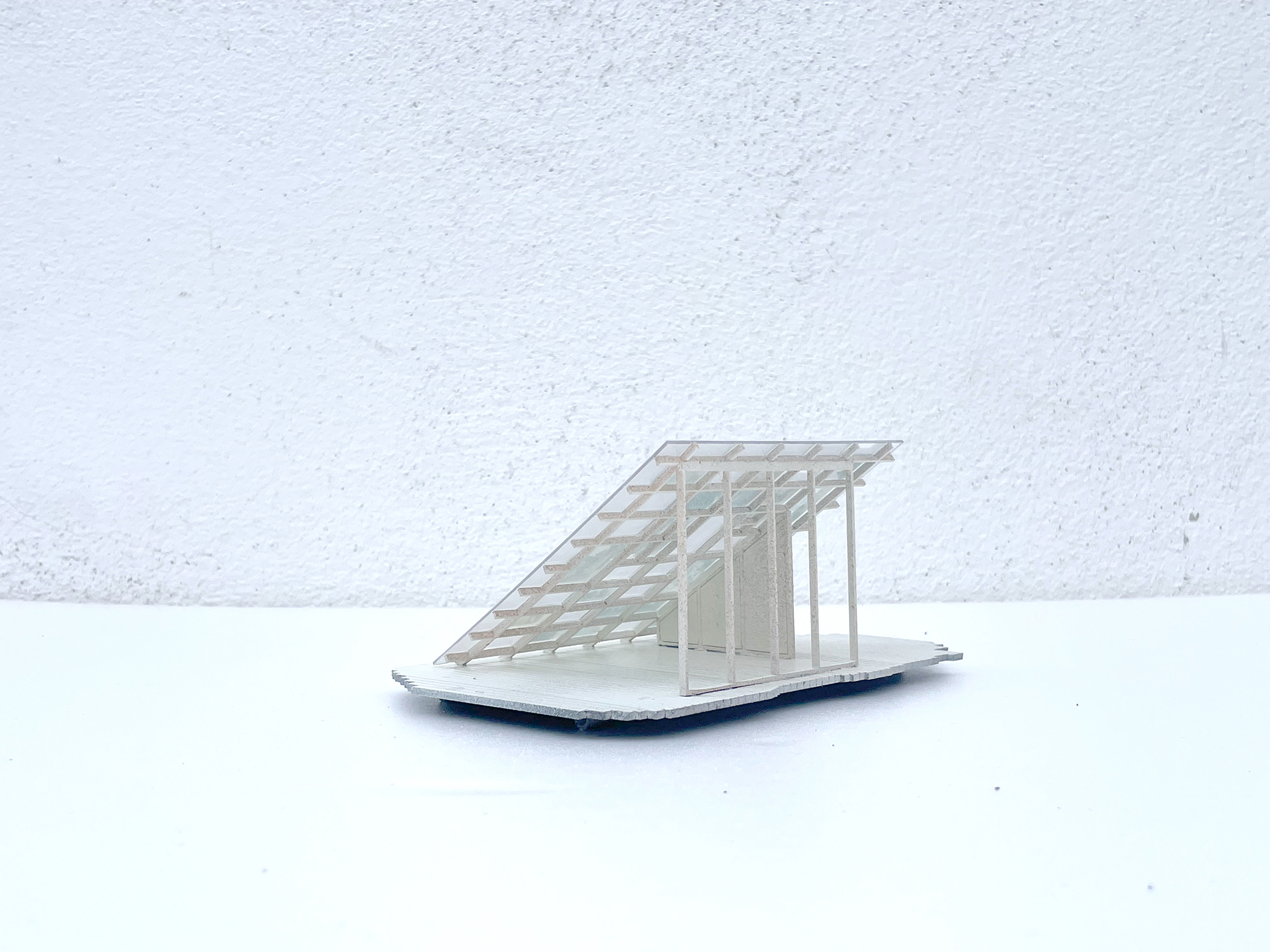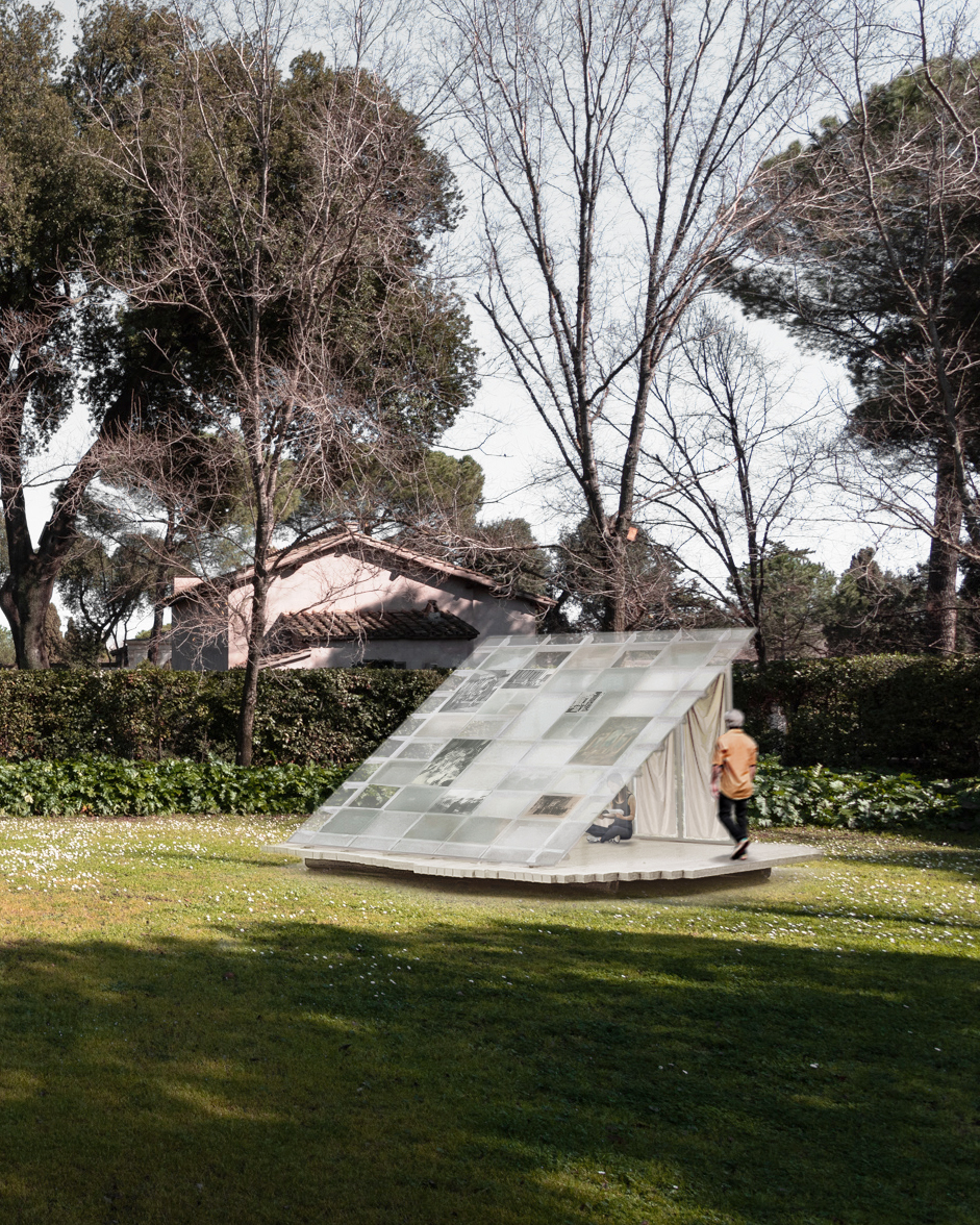 Cabane is a proposition of a temporary structure that aims to put the everyday memories of such individuals and collectives at the forefront. Located in the garden of the Villa, the proposal uses acrylic panels with photos from the archives of the Villa Medicis directly transferred onto them as roof panels. Supported by a set of walls and a raised platform both made of recycled wood, the assembled roof structure is placed in a diagonal manner, creating an intimate space underneath. Visitors are invited either to walk around, stay underneath the roof or simply look at it, making their own constructed memory of the place while having various views of the Villa in the background.