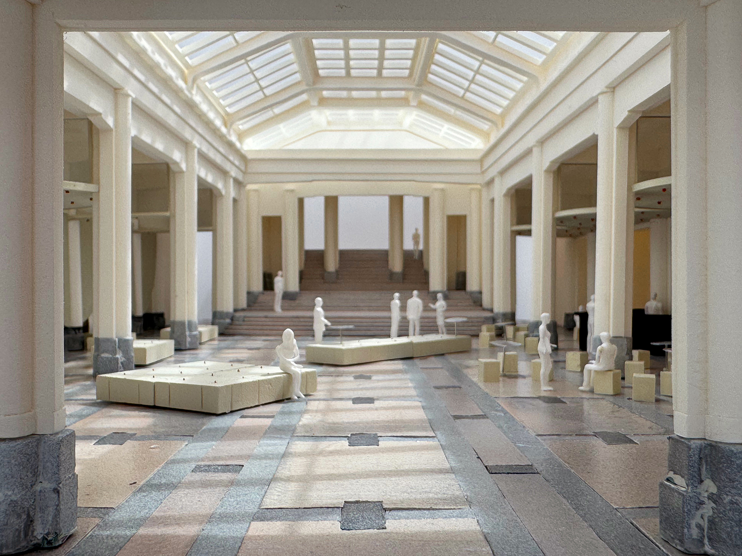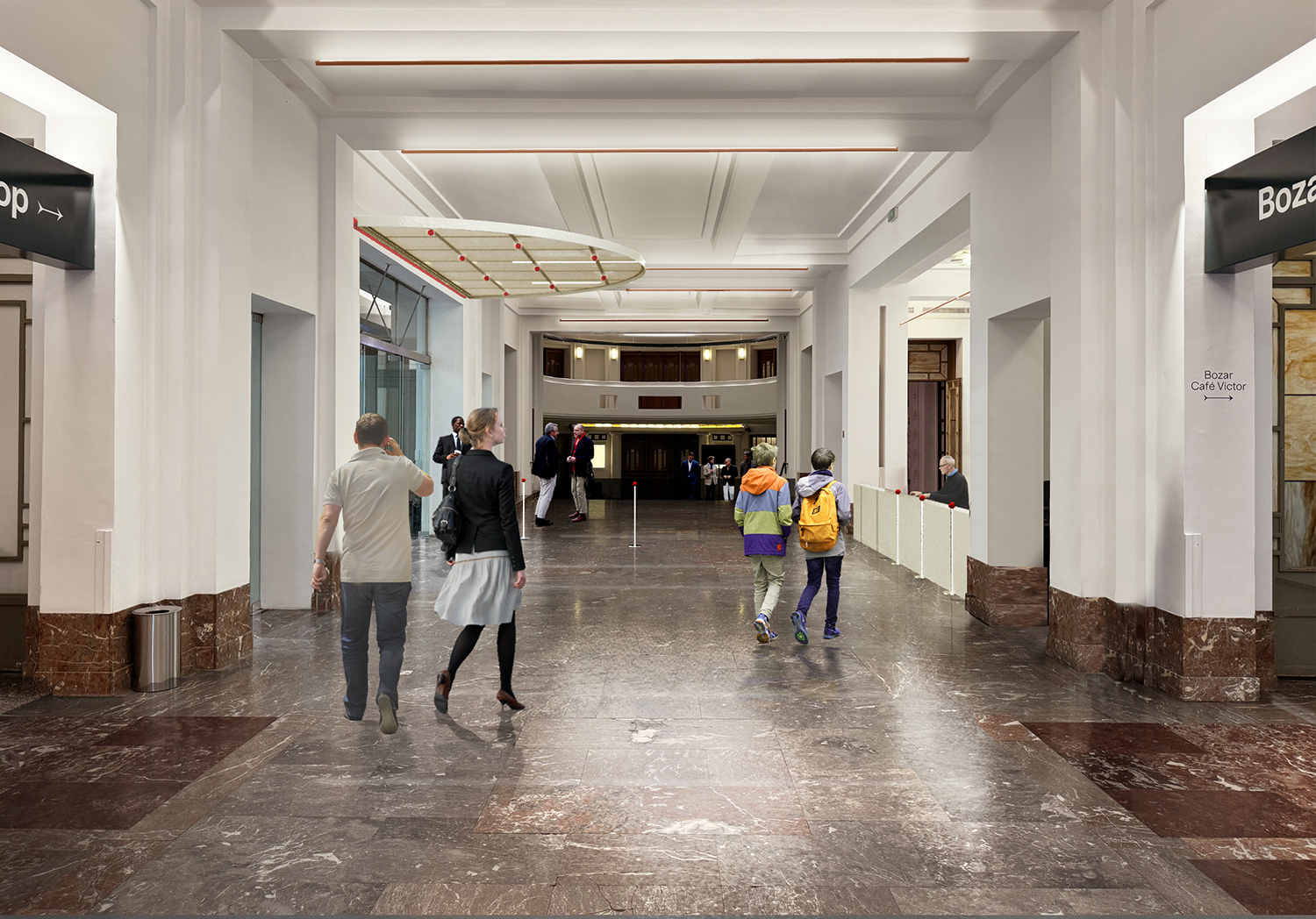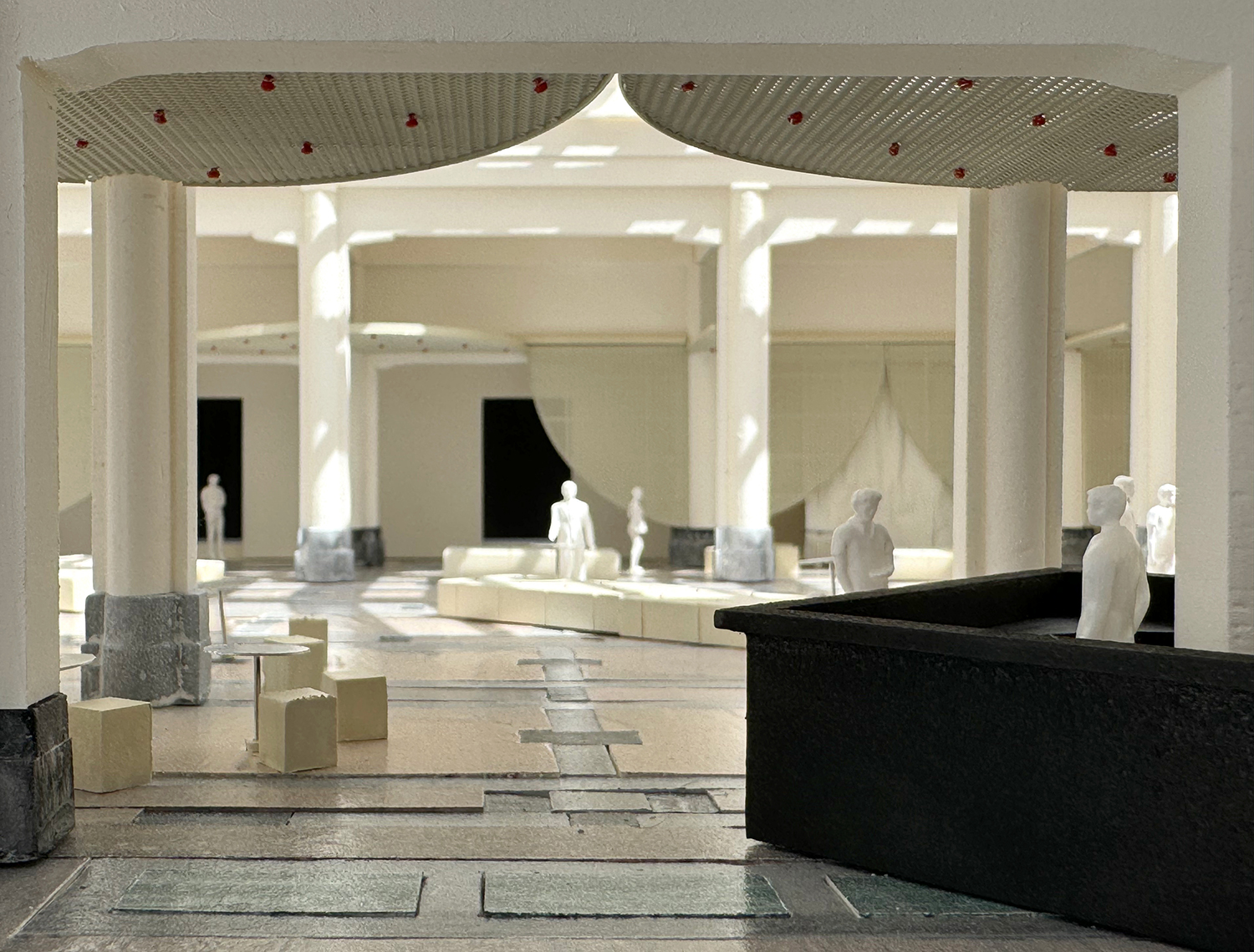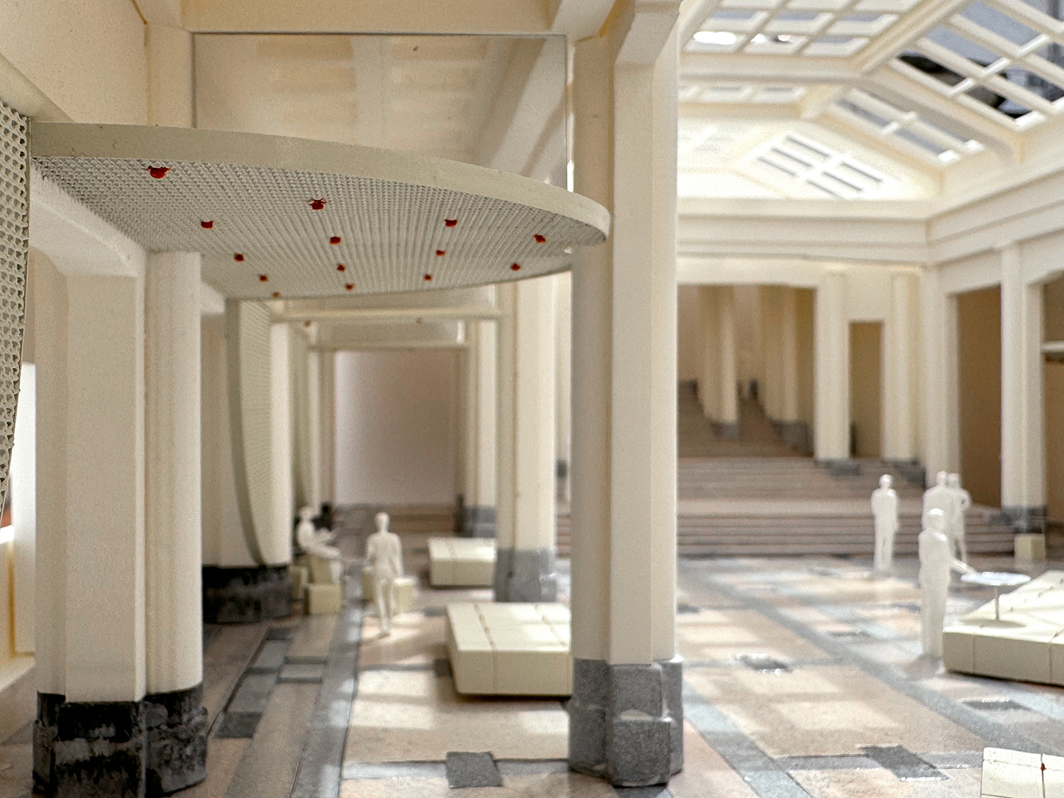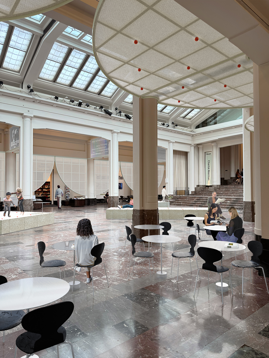 Whiplash in the Horta Hall is a response to transform the central hall of the BOZAR museum to a flexible space accommodating a variety of uses such as an entrance hall, an opening reception space, a performance space and more. Taking hint from art-nouveau canopy structures, our proposal introduces a set of retractable roofs within the galleries of the hall, seamlessly changing the characteristics of the hall according to the necessary needs. When lowered, the structure resembles a draped curtain, acting as a visual backdrop while providing storage behind. When raised, the structure activates the spaces behind the existing columns.